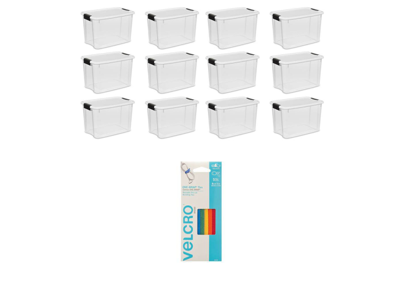 Sterilite 30 Quart Ultra Clear Plastic Storage Container (12 Pack) + Velcro Ties