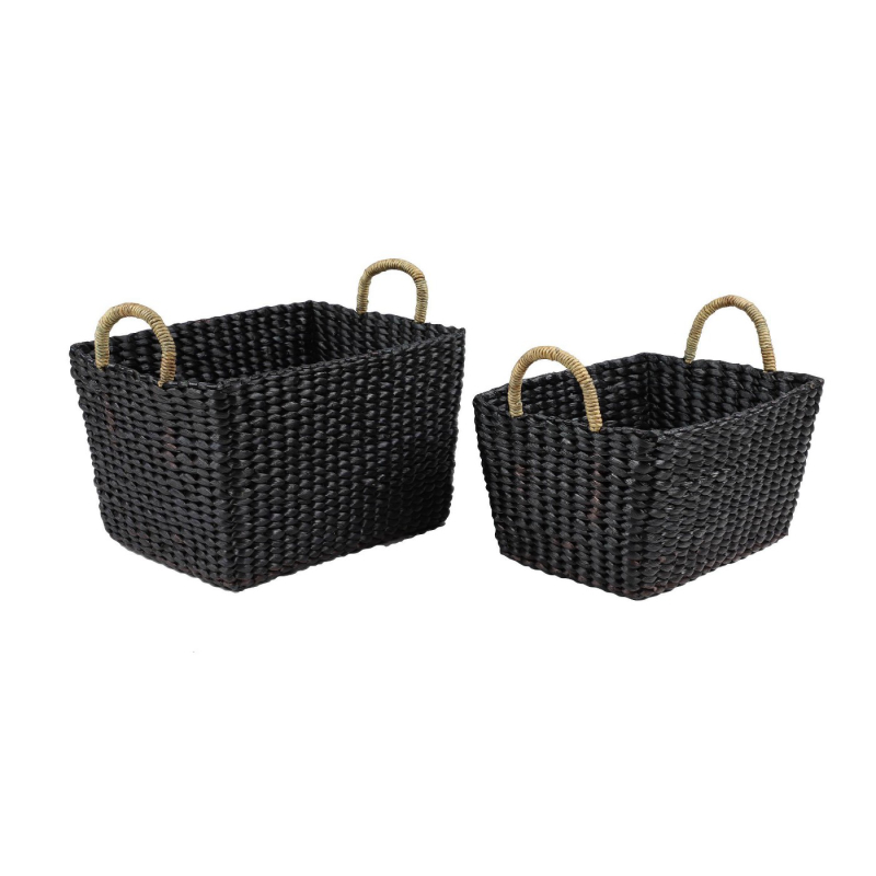 Olivia & May Set Of 2 Large Rectangular Handwoven Water Hyacinth Wicker Baskets With Banana Leaf Handles Black