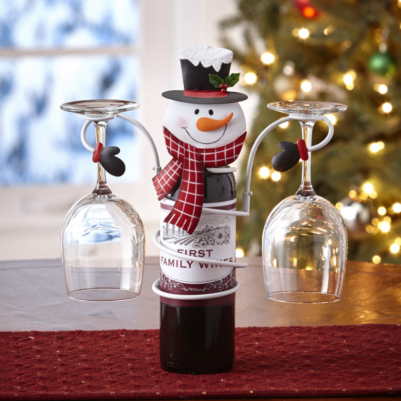 Lakeside Metal Holiday Snowman Wine Bottle And Glass Holder Stand Decoration