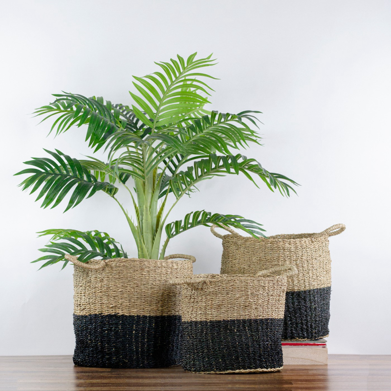 Northlight Set Of 3 Beige And Black Round Wicker Table And Floor Baskets